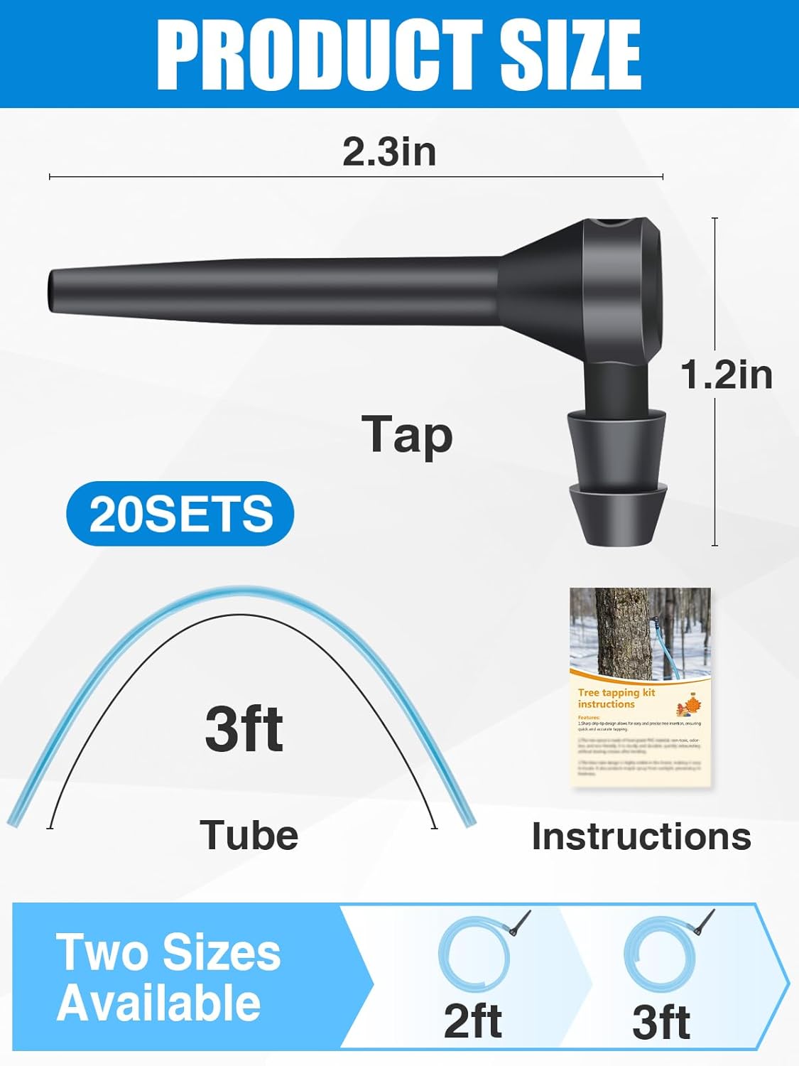 Do you want to try to collect maple sugar sap by yourself? Collect pure, natural maple syrup with your family! Fresh, healthy, and delicious! Our 20 sets of maple syrup tapping kits are enough to get you to collect a lot of maple sap! 20 Taps + 20 Tubes Set Material: Tube: Food-grade PVC Tap: PP Material Size: Tube: Length 90cm / 35.4in Tap: Length 5.8cm / 2.3in, Height 3.1cm / 1.2in Features: 20 sets are more than enough to satisfy your need for a large collection of maple sugar! Reusable, when you are done collecting you can wash them to use again the next year. Food-grade PVC material tube and high-quality PP material tap, good quality and durable. Our tap is less harmful to the maple tree, and the tree will recover in as little as 6 months. The drippers are blue and very conspicuous, making it easy to find your tools in the woods and also keeping the maple syrup fresh. Maple sap collection tips: Maple sap can only be collected at night when it is below zero degrees Celsius and during the day when it is above five degrees Celsius. Use an appropriate drill bit and drill at a slight upward angle. The depth of drilling into the maple tree is about 1.25-1.5". Also, in order not to damage the growth of the maple tree, it should be collected from a maple tree that has grown for more than 40 years, and only 1 hole is usually drilled in a maple tree.