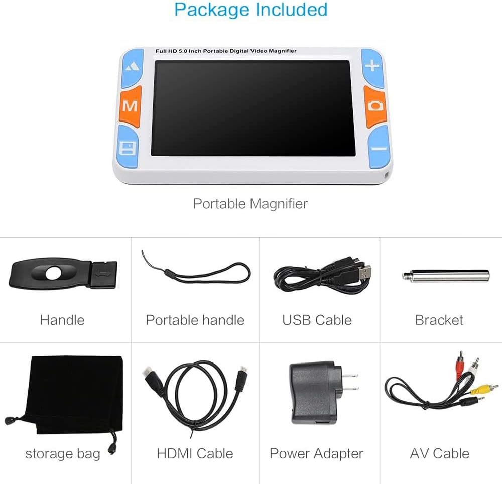 Note:People with severely impaired vision are not recommended to buy.Specifications:Screen size: 5.0 HD colorful LCD screen(800X480)Pixel size: 3 mega pixel (far focus lens), 3 mega pixel (near focus lens)Zoom rate: 3X to 48X infinite amplifyingColor pattern: 26 kindsMode custom-made: supportDual lens: supportWhite LED adjustment: supportBrightness adjustment: supportMemory function: supportImage freeze : supportImage pan: supportReading line: supportStorage and playback: supportStorage extended: 32G TF card support at most(no included)Flashlight function: supportTV output: support AV and HDMI 1080i60Voice prompt: supportVoice memo: support, 30s at mostBracket handle: supportWorking hours: last over 4 hoursBattery capacity: 2500mAH high-capacity chargeable lithium batteryDimension: 150mm(length)x 84mm(width)x 30mm(height)/ 5.9x3.3x1.2 inchWeight: 245g / 8.64oz(including the battery)