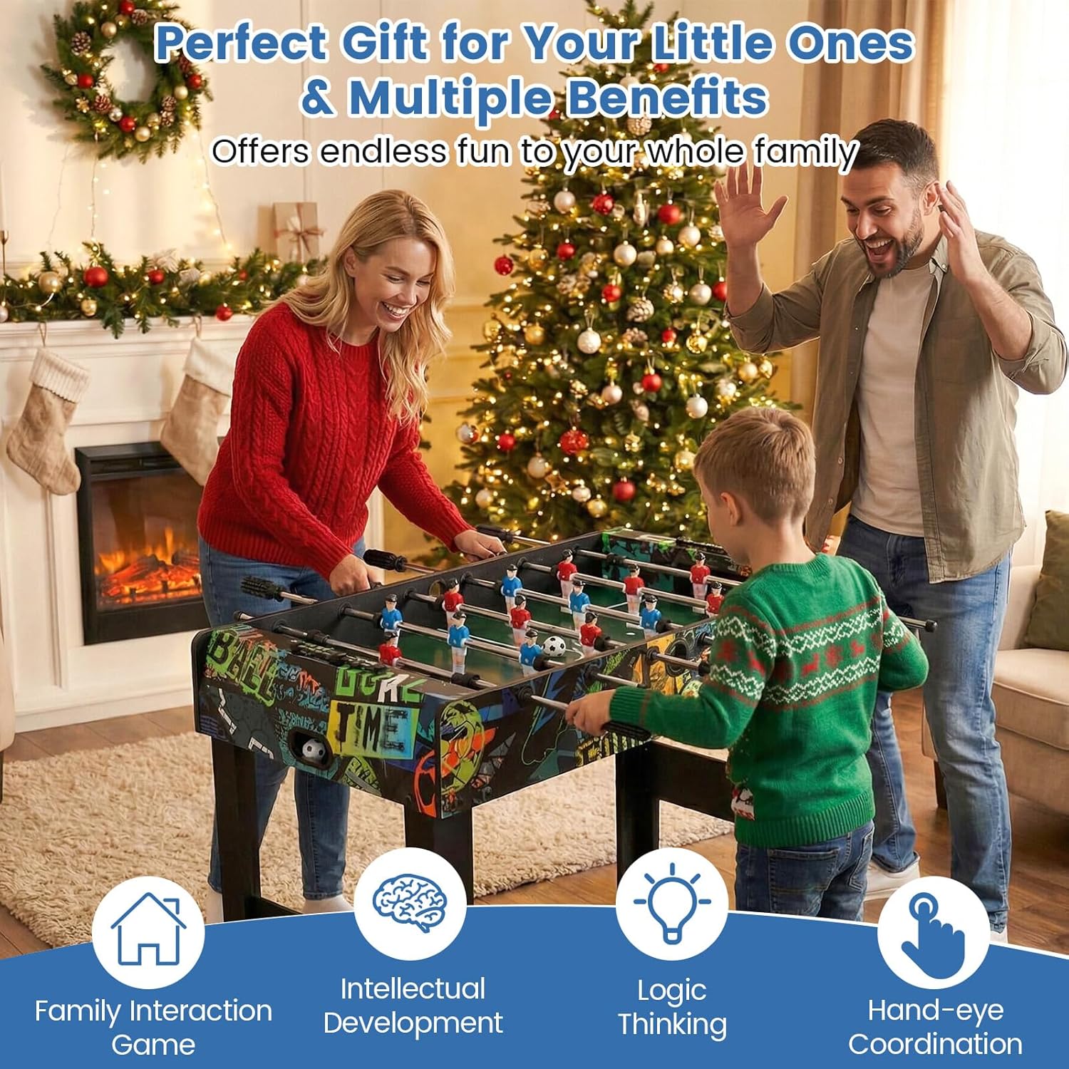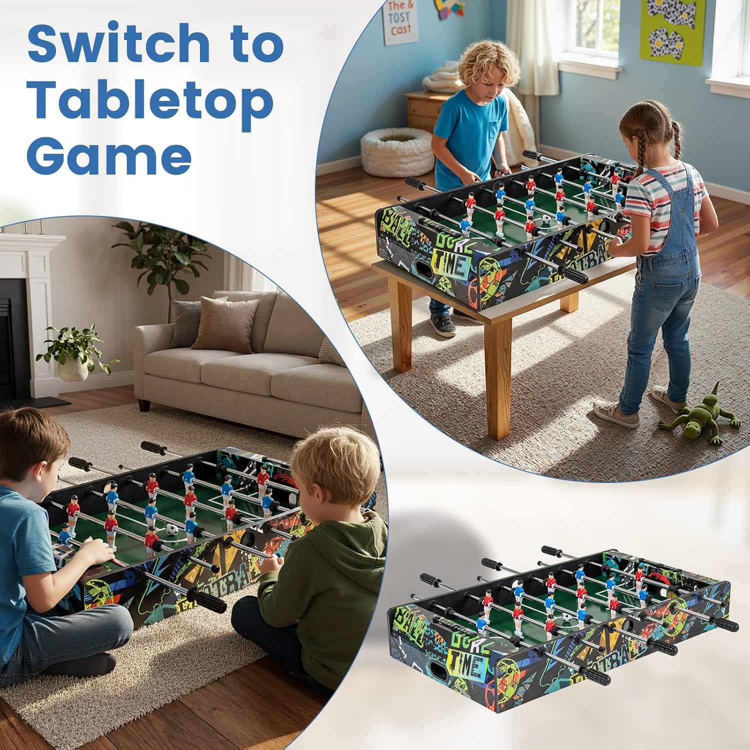 Description:Bring soccer excitement home with this immersive foosball game!Built to last, this mini foosball game features a premium wooden frame with reliable metal rods, comfortable non-slip PP handles for precise control, and four sturdy legs with anti-slip pads for extra stability. Measuring 37" x 20" x 27", this compact soccer game table saves space and suits any occasion, game nights, family gatherings, picnics, or office breaks. The detachable legs allow instant conversion to tabletop mode for play on any flat surface without height restrictions. With its cool design, simulated players, and realistic field, this game improves children's hand-eye coordination while encouraging friendly competition, making it a perfect birthday, Christmas, or holiday gift.Features:Premium wooden frame and reliable metal rods ensure long-lasting durabilityComfortable non-slip PP handles provide easy control of all playersVersatile design suits game nights, family gatherings, picnics, or office breaksRemovable legs allow instant conversion to tabletop play on any surfaceCool graphics, simulated players, and realistic field enhance visual appealImproves children's hand-eye coordination through engaging competitive playPerfect birthday, Christmas, or holiday gift that encourages friendly competitionSpecifications:Color: BlackMaterial: MDF, MetalProduct Dimensions: 37" x 20" x 27" (L x W x H)Length of the Metal Rods: 34"Net Weight: 20.5 lbsPackage Includes:1 x Foosball Table2 x Balls1 x User’s Manual