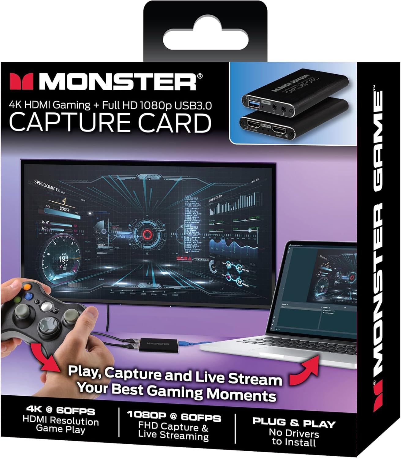 Take your gaming and streaming experience to the next level with the Monster Capture Card. Featuring 4K 60FPS gameplay pass-through, this device ensures you experience the highest level of visual clarity while playing on your favorite gaming systems. Whether you're a PC gamer or prefer the versatility of consoles like the Switch, Xbox, or PS5, this capture card is designed to support them all. Capture and stream your gameplay in crystal-clear 1080p at 60FPS, delivering professional-grade video quality that ensures your content is smooth, vibrant, and ready for all streaming platforms. This capture card is not just about visuals; it’s packed with versatile connection options. With HDMI input and HDMI & USB 3.0 output, it offers an easy setup for multiple devices. You can connect it to your computer, monitor, or gaming system, giving you the flexibility to stream or record directly from your preferred setup. The built-in microphone and headphone input/output ports allow you to record commentary or monitor your audio in real-time, eliminating the need for additional audio equipment. This feature is ideal for streamers and gamers who require clear and instant feedback without any audio lag. The compact and portable design makes it perfect for gaming on the go, whether you’re recording at home or capturing footage at an event. Its durability and reliability ensure it’s built to last, making it the ultimate tool for gamers and streamers who demand high performance. Unlock your potential with the Monster Capture Card and start streaming like a pro today!