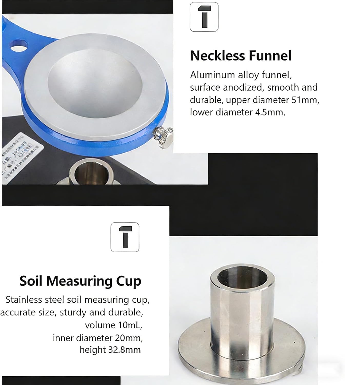 Specifications Product Name: Soil Swelling Rate Tester Dimensions: Neckless funnel: upper diameter 51mm, lower diameter 4.5mm; Measuring cup: volume 10mL, inner diameter 20mm, height 32.8mm Stirring rod: 250mm long Packaging List: Soil Swelling Rate Tester *1
