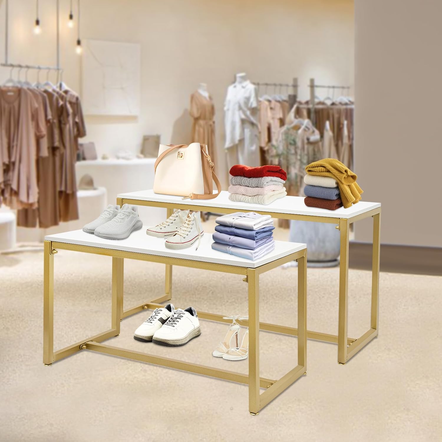 ApplicationIt can be widely used in homes, clothing shops, hotels, garment factories, and clothing studios to organize and display your sneakers, high tops, slippers, sandals & espadrilles, high heels & booties, handbags, and purses in retail stores.SpecificationMaterial: Steel Pipe, Melamine BoardSurface Treatment: Nano Baking PaintColor: Gold, WhiteStyle: Casual, SimpleGross Weight: 7kg/15.43lbsNet Weight: 6.5kg/14.22lbsFixing Method: Screw ConnectionPackage Size: 93*15*42cm/36.61*5.91*16.54inLarge One Size: 100*40*56cm/39.37*15.75*22inSmall One Size: 80*40*46cm/31.5*15.75*18.1inEach Load Capacity: 50kg/110lbsPackage Included4* Crossbars4* Frames2* Melamine Boards8* Screws2* Bottom RodsNotesPlease allow the slight color difference caused by the shooting light and 1-3 cm error due to manual measurement, and make sure you do not mind before ordering.