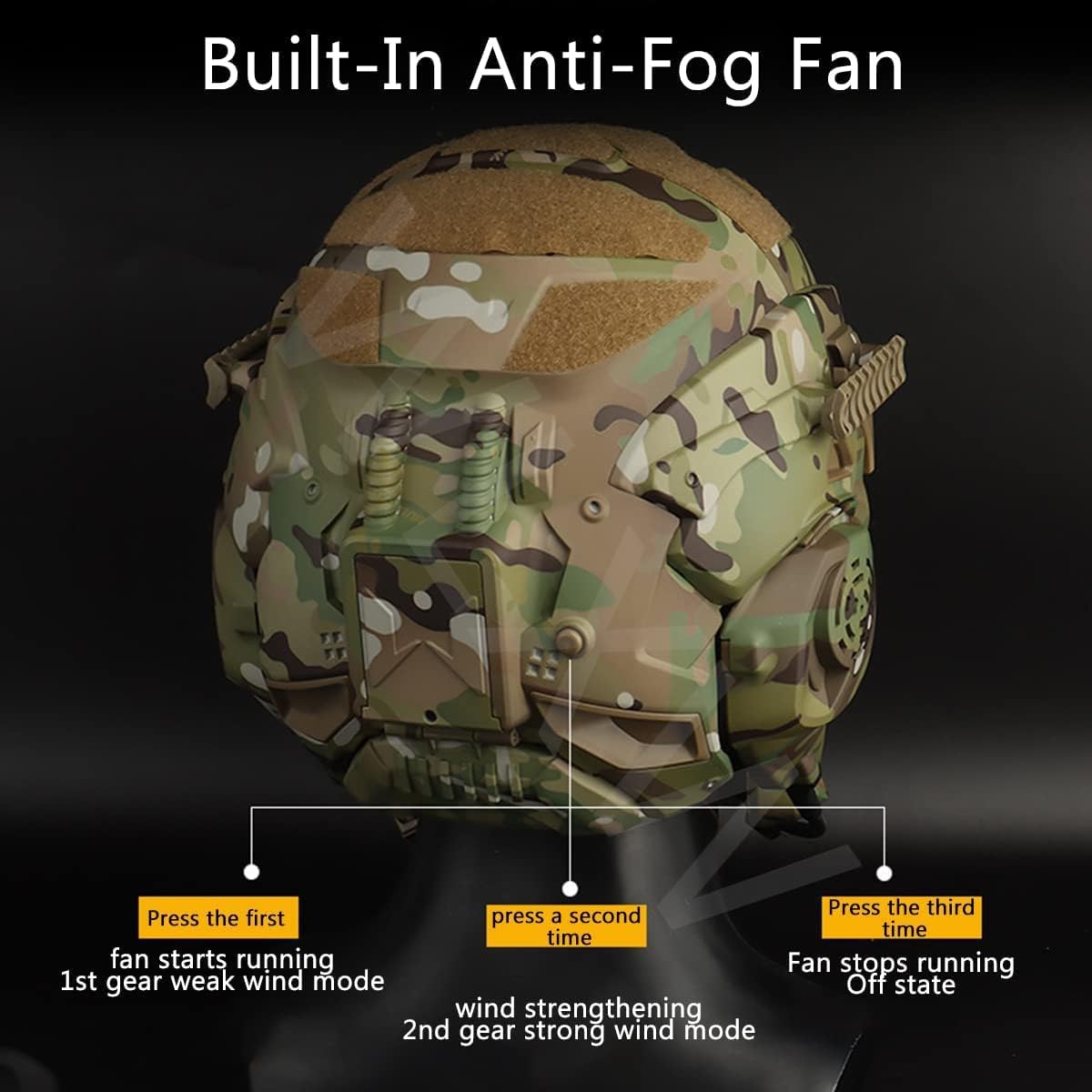 Multifunctional 3-in-1 Airsoft Full-Face Tactical Military Helmet, the mask/helmet/goggles together form a unified whole cool full-face helmet, worth having! Welcome to buy Features: Material: High Quality ABS+Nylon Size: 32cm/12.5" high, two sizes 26cm/10" long, suitable for head circumference 54-64cm/21.2-25.2" (adjustable) Tactical Goggles: Grey lenses improve background contrast and clarity when worn in the sun, Clear Lenses Clear lenses are mainly used on cloudy or rainy days and can be worn at night. Built-in anti-fog fan There is a battery compartment on the back of the helmet that uses 3AA batteries (not included) to power the built-in fan headset The helmet has a built-in anti-fog fan, which can effectively prevent the goggles from fogging. Press the first one: the fan is running in low wind mode Press twice: the fan operates in the second gear high wind mode 3rd press: Fan stops and shuts down Side rails/night vision goggle guards, bungee mounts for night vision goggles provide a starting point for quick frame changes or publications such as night vision equipment, flashlights, cameras, sun visors, flashes, batteries, etc. THE SUPER PERFECT FULL HELMET: Charge into the battlefield without worrying about damage from BB fire with this highly protective, breathable tactical full helmet! Satisfy your needs for the perfect airsoft game.