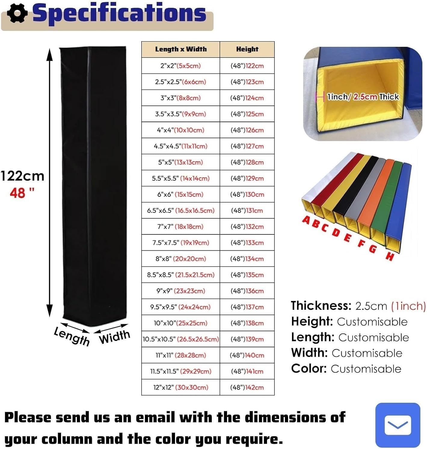 ●Specifications● Thickness: 1 inch ( 2.5 cm ) High-Density Foam Core● Height: 48 inch ( 122 cm ) Full-Length Protection● Material: Durable PU Leather + Soft Cotton Interior● Closure: Tool-Free Velcro Wrap● Compatibility: Fits Square Poles from 2" x 2" to 12" x 12" ( 5 cm x 5 cm - 30 cm x 30 cm )● Custom Service: Size & color options available upon request●Features:1" thick high-density foam basketball pole pad safeguards players during intense play.Weatherproof materials keep pole pad looking new.It's user friendly assembly makes installing this basketball pole pad a breeze.●Package Includes:1 x Basketball Pole Pad●Warm TipsManual measurement,there will be 1-3cm error, please understandIf a slight odor is normal, it will disappear within two to three daysDue to light and personal differences in color understanding, there will be small color difference,in kind prevail
