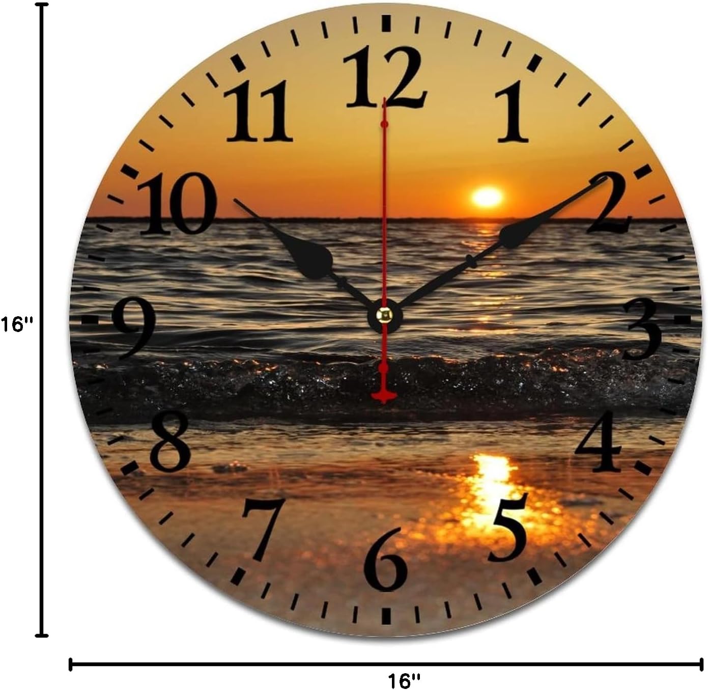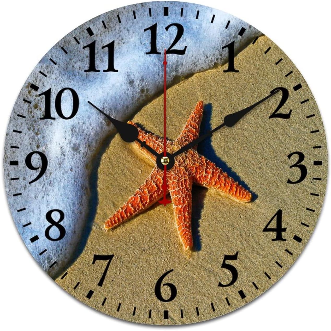 Starfish Sand Wave Ocean Sea Summer Kitchen Wall Clock 16 Inch Farmhouse Antique Silent Non Ticking Battery Operated Vintage Country Rustic Distressed Wood ClockLarge Number-Large numbers, easy to see from a distance or sideMetall Hands-The precise metal hands tell the time exactly, durableMetall Hands-The precise metal hands tell the time exactly, durableSuper Quiet-Quiet sweep second hand, no"TICK TOCK" to ensure a good sleepingBattery-Requires one AA battery (not included in the package)Easy to Hang-Back slot design offers easy installation, 1 non-track hook includedLarge decorative round wall clock is perfect for office ,living room, classroom, bedroom, bathroom.Please check it before usePlease check that the second hand is bent before use.All our products are strictly inspected,but this problem is unavoidable in the course of transportation.If the hands are curved, you can adjust them directly with your hands to keep them parallel.We apologize for the inconvenience.