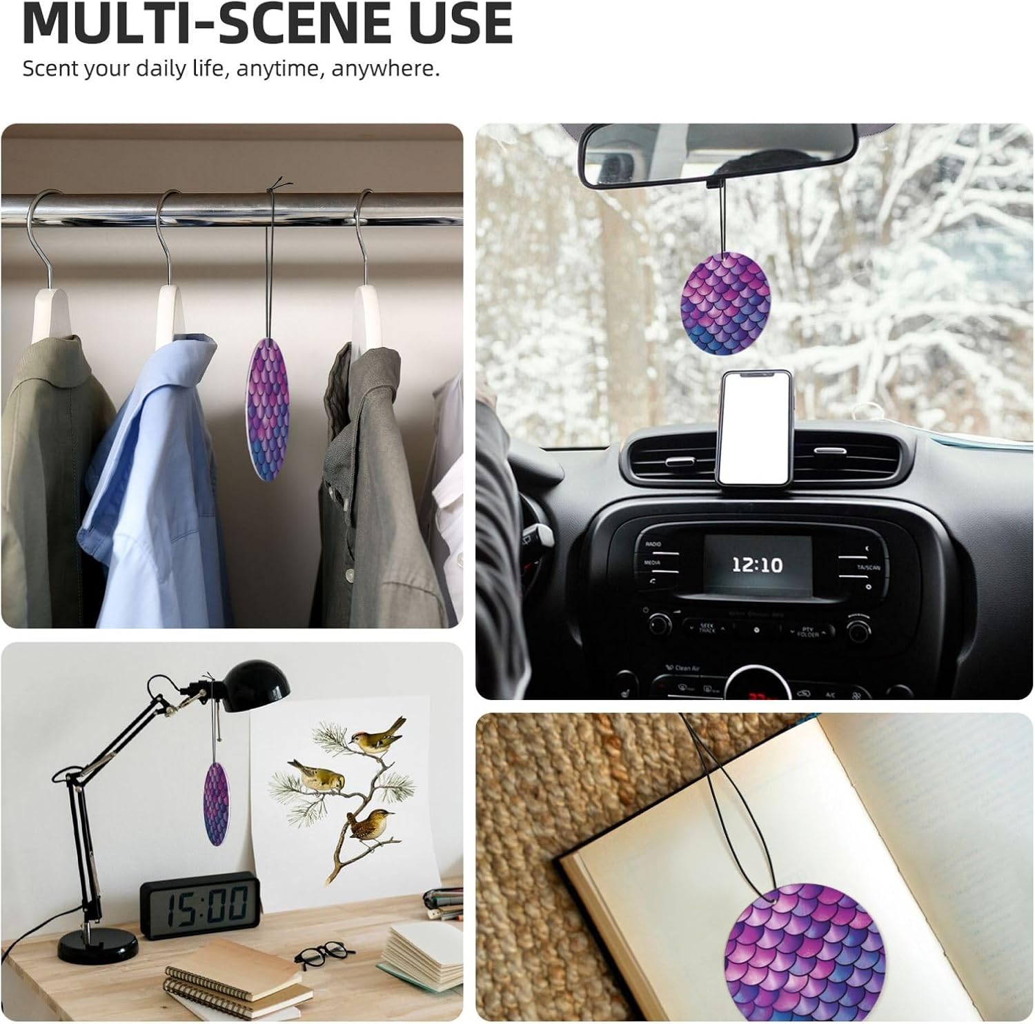 unobstructed vision: this Purple Pink Scale rearview mirror scented fresheners doesn't obstruct your vision while driving, ensuring a safe and comfortable journey every time.easy hang: we've included a convenient rope for hanging, making it super easy to attach this christmas air freshener wherever you prefer. No fuss, no mess - just hang and enjoy the fragrance.incredible package deal: this rearview mirror pendant aromatherapy tablets package includes 6 pieces in 6 captivating designs and 1 refreshing scents (lavender). Experience a variety of delightful fragrances that will keep your surroundings smelling wonderful throughout the day.environmental protection: the car air fresheners for women smell can last for about 1-2 weeks. When the smell fades, you can add your favorite perfume. Continue to use, reusable6 pcs included: you will receive 5 individual shoe cabinet fresheners, each in its own package; enjoy consistent scents for nearly a year, or share them with your friends or families